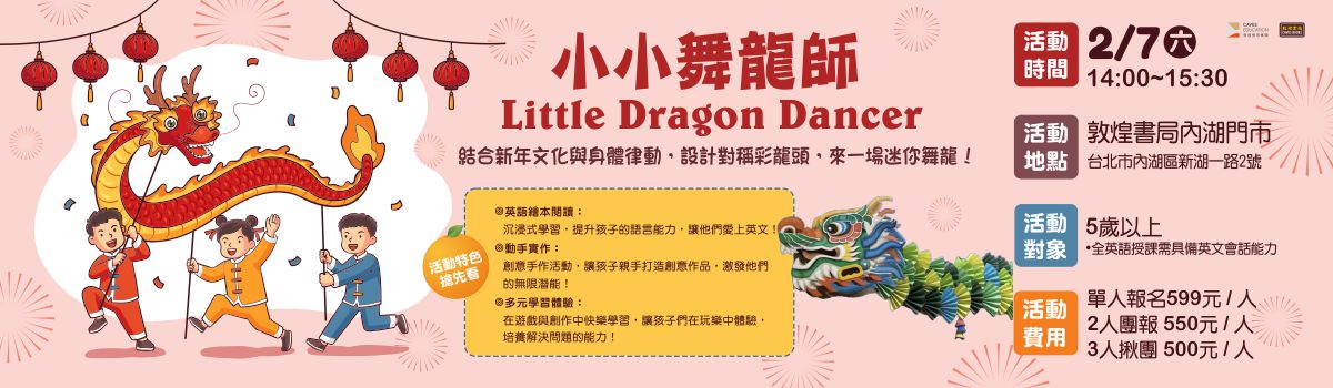 假日親子充電站 | STEAM & STORY 素養活動 每月主題活動帶孩子進入奇幻情境, 結合英語繪本、創意手作與STEAM體驗, 啟發語言力、想像力與觀察力!主題: 結合新年文化與身體律動,設計對稱彩龍頭,來一場迷你舞龍!