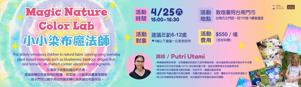 【家裡其實藏著彩虹!】讓小朋友透過接觸自然食物例如藍莓、甜菜根、火龍果與薑黃等植物,孩子們可以親手將自然資源轉化為美麗的布藝作品。