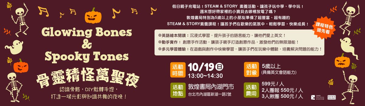 假日親子充電站 | STEAM & STORY 素養活動 每月主題活動帶孩子進入奇幻情境, 結合英語繪本、創意手作與STEAM體驗, 啟發語言力、想像力與觀察力!主題:Glowing Bones & Spooky Tones 人體科學結合萬聖節,打造一場光影與知識共舞的夜晚!