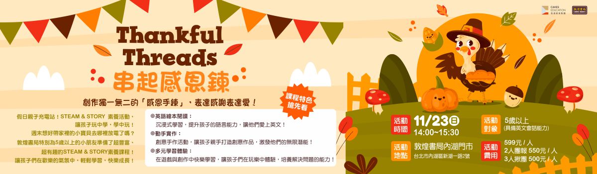 假日親子充電站 | STEAM & STORY 素養活動 每月主題活動帶孩子進入奇幻情境, 結合英語繪本、創意手作與STEAM體驗, 啟發語言力、想像力與觀察力!主題:Thankful 透過故事、透過互動、透過動動手,用心體會,用心感受愛與感恩,並且表達!