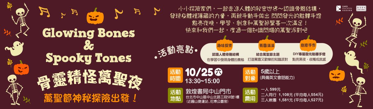 🧠 活動主題: 骨靈精怪萬聖夜 Glowing Bones & Spooky Tones 📅 活動日期與時間: 2025/10/25(六) 下午 1:30 – 3:00 📍 地點:敦煌書局 中山門市 🎃👻 萬聖節神秘探險出發! 小小探險家們,一起走進人體的秘密世界~ 認識骨骼結構,發現身體裡隱藏的力量 💪 再親手動手做出 閃閃發光的骷髏手燈 ✨💀 點亮夜晚,學習、創意和萬聖節驚喜一次滿足! 快來和我們一起,度過一個知識閃耀的萬聖派對吧!🎉 ✨ 活動亮點 ✨ 1️⃣ 趣味探索 —— 認識人體骨骼結構,在學習中發現身體的奧秘 2️⃣ 氛圍滿滿 —— 結合萬聖節主題,打造驚喜又歡樂的知識派對 3️⃣ 創意手作 —— DIY專屬發光骷髏手燈,點亮黑夜,收穫成就感