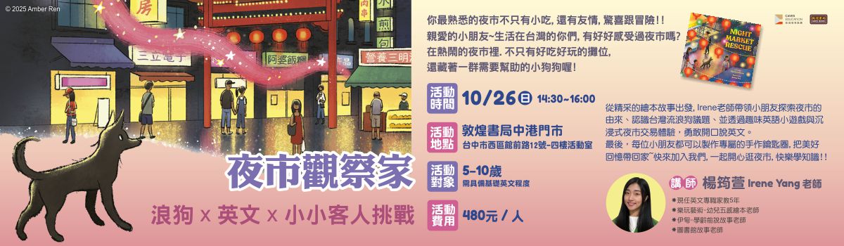 你最熟悉的夜市不只有小吃,還有友情,驚喜跟冒險!! 親愛的小朋友~生活在台灣的你們,有好好感受過夜市嗎? 在熱鬧的夜市裡.不只有好吃好玩的攤位,還藏著一群需要幫助的小狗狗喔! 由精采的繪本故事出發,Irene老師帶領小朋友探索夜市的由來、認識台灣流浪狗議題、並透過趣味英語小遊戲與沉浸式夜市交易體驗,勇敢開口說英文。最後,每位小朋友都可以製作專屬的手作鑰匙圈,把美好回憶帶回家. 快來加入我們.一起開心逛夜市,快樂學知識!!