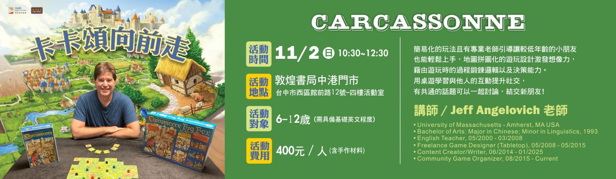 University of Massachusetts - Amherst, MA USA Bachelor of Arts: Major in Chinese; Minor in Linguistics, 1993 English Teacher, 05/2000 - 03/2008 Freelance Game Designer (Tabletop), 05/2008 - 05/2015 Content Creator/Writer, 06/2014 - 01/2025 Community Game Organizer, 08/2015 - Current 活動資訊 時間:11/2 星期日 10:30~12:30 地點:敦煌書局中港店 年齡:6歲至12歲(需有基本英文能力) 報名:400元 /含手作材料